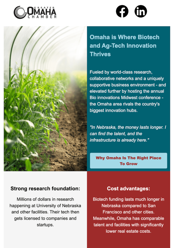 The Greater Omaha Chamber needed to modernize its economic development website and build an integrated content campaign to reach a national audience of business leaders, investors, and site selectors. The goal: showcase Omaha’s strength across high-priority industries, drive inbound interest from relocation or expansion prospects, and position Omaha as a hub for innovation and opportunity.